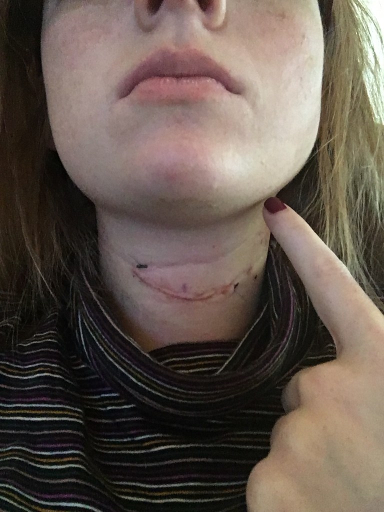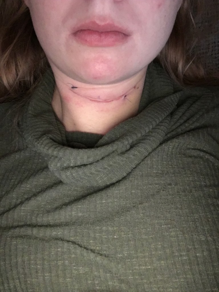 I was unable to turn my head without the stitches pinching my neck. The way they were positioned made it to where I was stuck looking down, leaving my head in a constant, depressed, bow. It hurt to talk, it hurt to laugh, it hurt to cry, it hurt to eat, it hurt to sneeze, it hurt to yawn, and it really, really hurt to swallow.