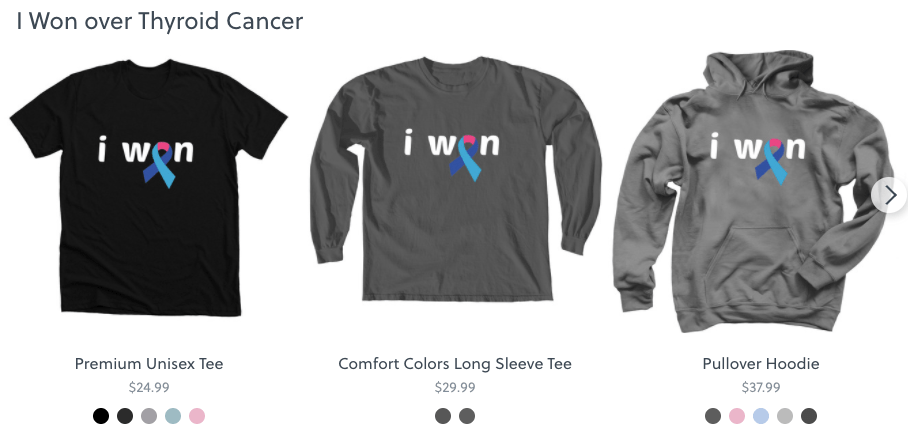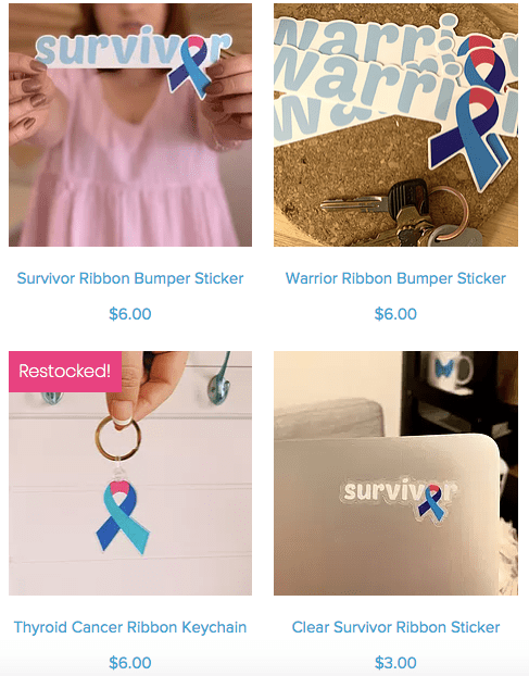Merchandise & Gifts Kendra Scott: Butterfly Strand Necklace- HERE Kendra Scott: Butterfly Pendant Necklace- HERE Ana Luisa Butterfly Necklace-HERE Kendra Scott: Butterfly Earrings-HERE Etsy: Thyroid Fighter T-Shirt- HERE Etsy: Survivor Ball Cap- HERE Etsy: Thyroid Cancer Warrior T-Shirt- HERE Etsy: No One Fights Alone T-Shirt- HERE ThyCan Survivors: Stickers&Keychains – HERE ThyCan Survivors: T-Shirts – HERE Between Two Kingdoms, Memoir by Suleika Jaouad- HERE It’s Not Supposed to Be This Way, Christian Memoir by Lysa Terkeurst- HERE